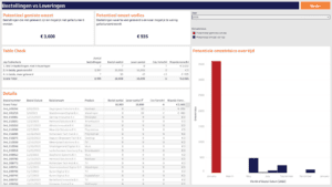 In de tabel bij bestellingen zie je bijvoorbeeld orders waarin laptops, koptelefoons of airfryers wel besteld maar nog niet geleverd zijn. De verschillen variëren van één of twee stuks tot grotere aantallen. Doordat het dashboard niet alleen aantallen toont maar ook de waardeverschillen, ziet de controller meteen welke afwijkingen financieel het zwaarst wegen.